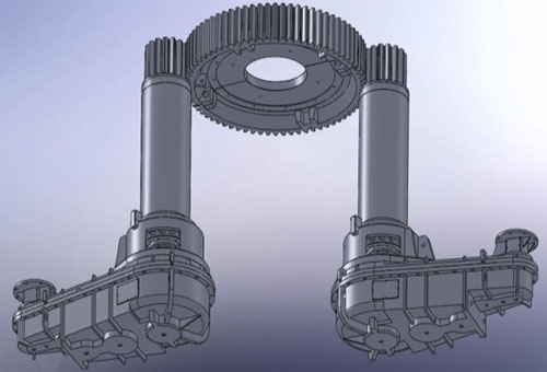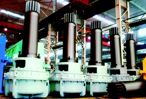傳動(dòng)裝置由減速機(jī)、輸出齒輪軸、偏心套組件及填料環(huán)組件等幾部分組成。減速機(jī)由變頻調(diào)速電機(jī)經(jīng)限力聯(lián)軸器直接驅(qū)動(dòng),通過(guò)5級(jí)硬齒面圓柱齒輪傳動(dòng),由內(nèi)花鍵軸傳遞給輸出齒輪軸。偏心套、滑動(dòng)軸套和填料環(huán)裝配后經(jīng)聯(lián)結(jié)法蘭和減速機(jī)一起把合在爐體上。可通過(guò)調(diào)整減速機(jī)和偏心套的相對(duì)把合位置來(lái)調(diào)整開(kāi)式齒輪傳動(dòng)的中心距以補(bǔ)償由于高溫產(chǎn)生的形變
