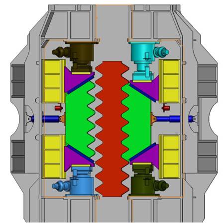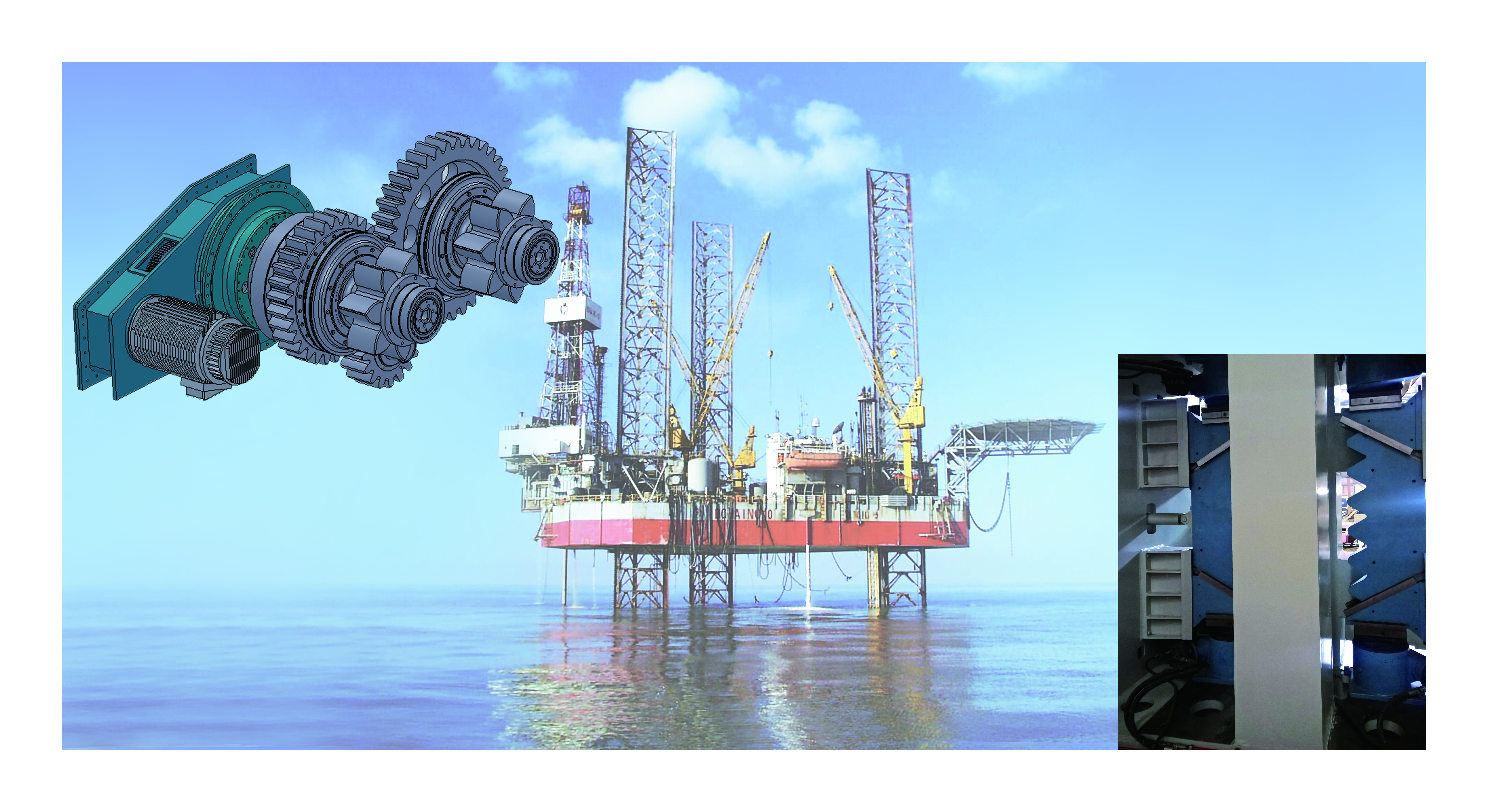 升降系統(tǒng)采用齒輪齒條嚙合原理實現(xiàn)平臺或樁腿的升降操作。安裝在船體的固樁架上,可以采用電機和液壓馬達驅(qū)動,每一升降單元有爬升齒輪、減速機、電機/液壓馬達和具有自動保護功能的電磁剎車組成。配有電機控制中心、中央控制臺和樁邊控制柜;鎖緊系統(tǒng)由液壓驅(qū)動,由螺桿升降裝置,鎖緊齒塊,楔塊,油缸和分配器,泵站,樁邊控制柜等組成。