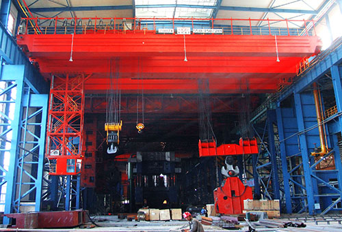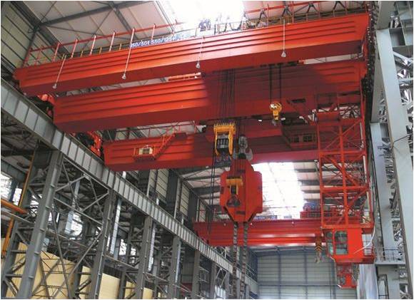 鍛造起重機(jī)工作時(shí),主、副鉤配合吊起工件,通過專用吊具(翻料機(jī))翻轉(zhuǎn)工件,工件被調(diào)整到適當(dāng)角度后放置于液壓機(jī)砧板上,液壓機(jī)開始工作。重復(fù)上述工作若干,直到工件被鍛造成合格品。由于鍛造過程中整機(jī)將受到較大的沖擊載荷,因此鍛造起重機(jī)設(shè)置有緩沖裝置及松閘裝置。此外鍛造起重機(jī)還擔(dān)負(fù)著廠房?jī)?nèi)物料吊運(yùn)及設(shè)備安裝、維護(hù)等工作。