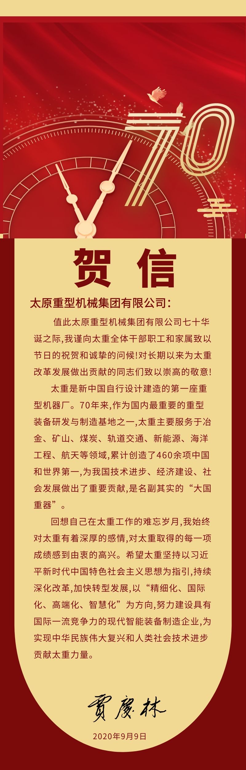 【賀信】太重老廠長(zhǎng)賈慶林同志祝賀太重建廠70周年!