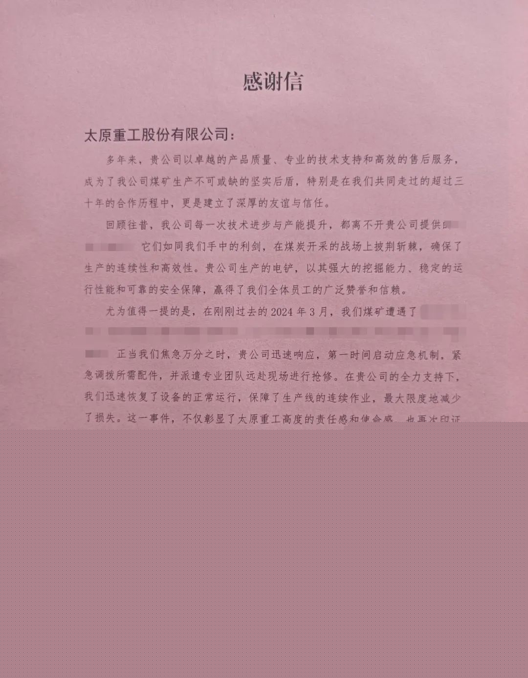 近日,太重收到一封來自合作三十多年內(nèi)蒙古用戶的感謝信,公司以精湛的制造工藝、卓越的產(chǎn)品性能以及貼心的售后服務(wù),贏得用戶高度認可,成為用戶不可或缺的合作伙伴。