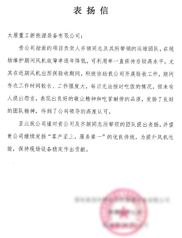 專業(yè)、敬業(yè),吃苦耐勞,用戶至上、服務第一……一份感謝、一份認可。近日,新能源公司運維團隊收到風電用戶送來的感謝信,真誠為太重服務點贊!