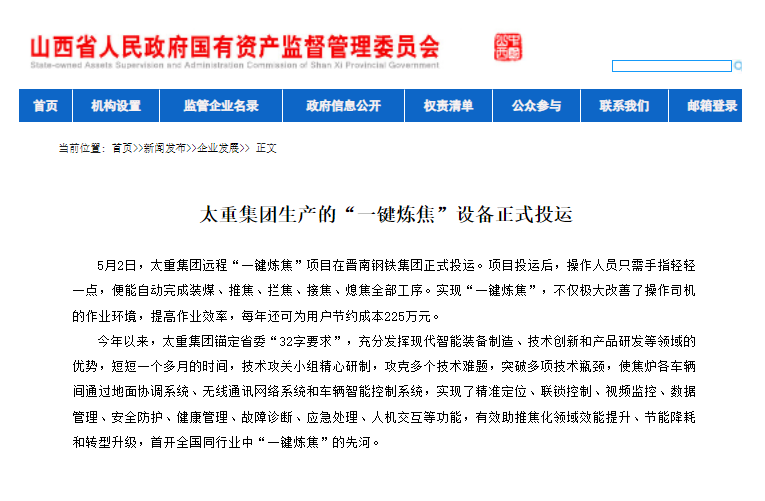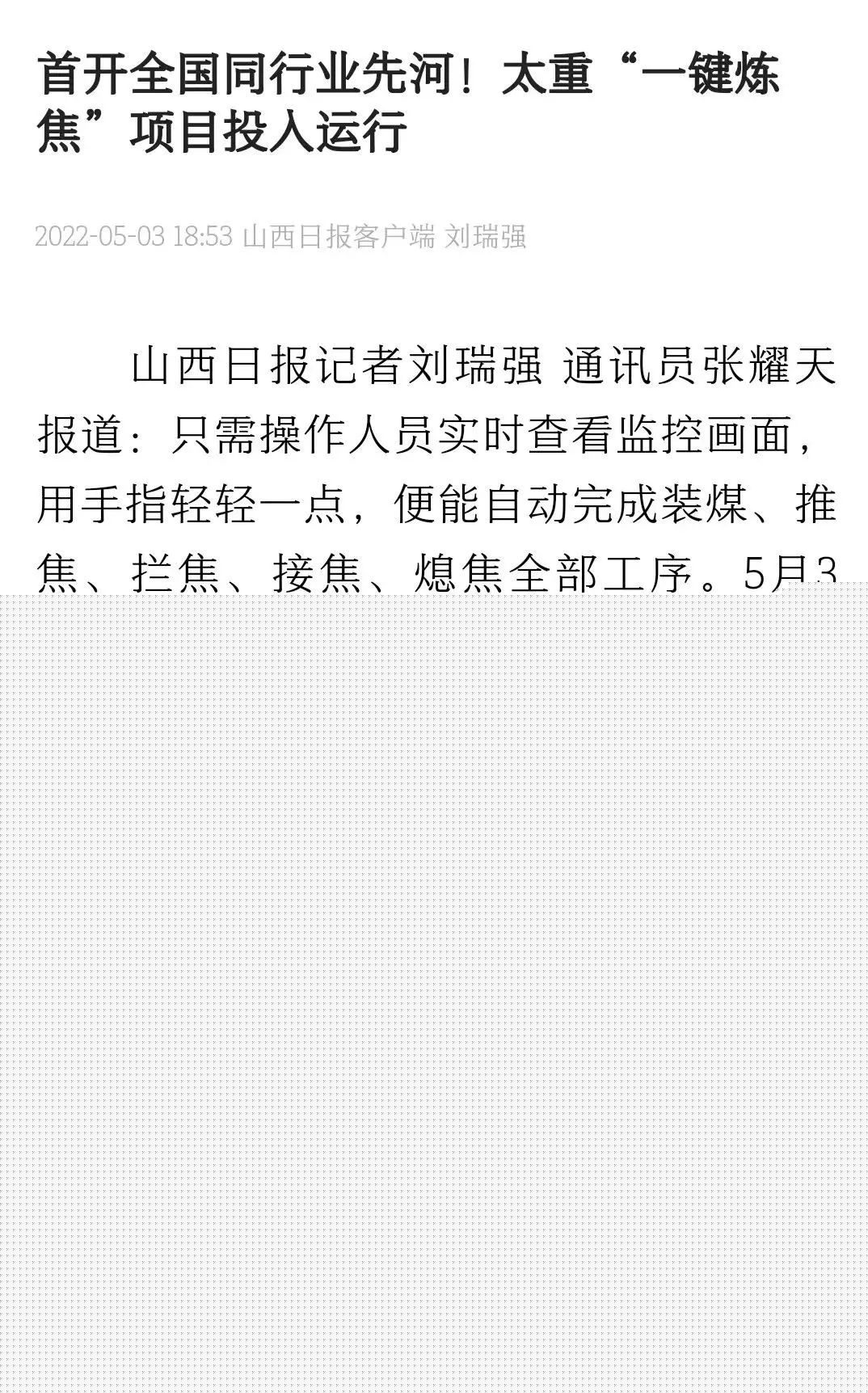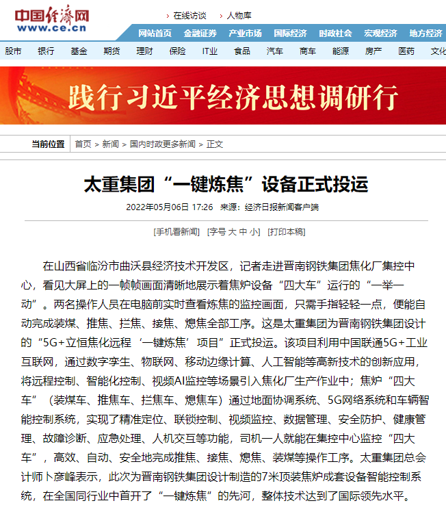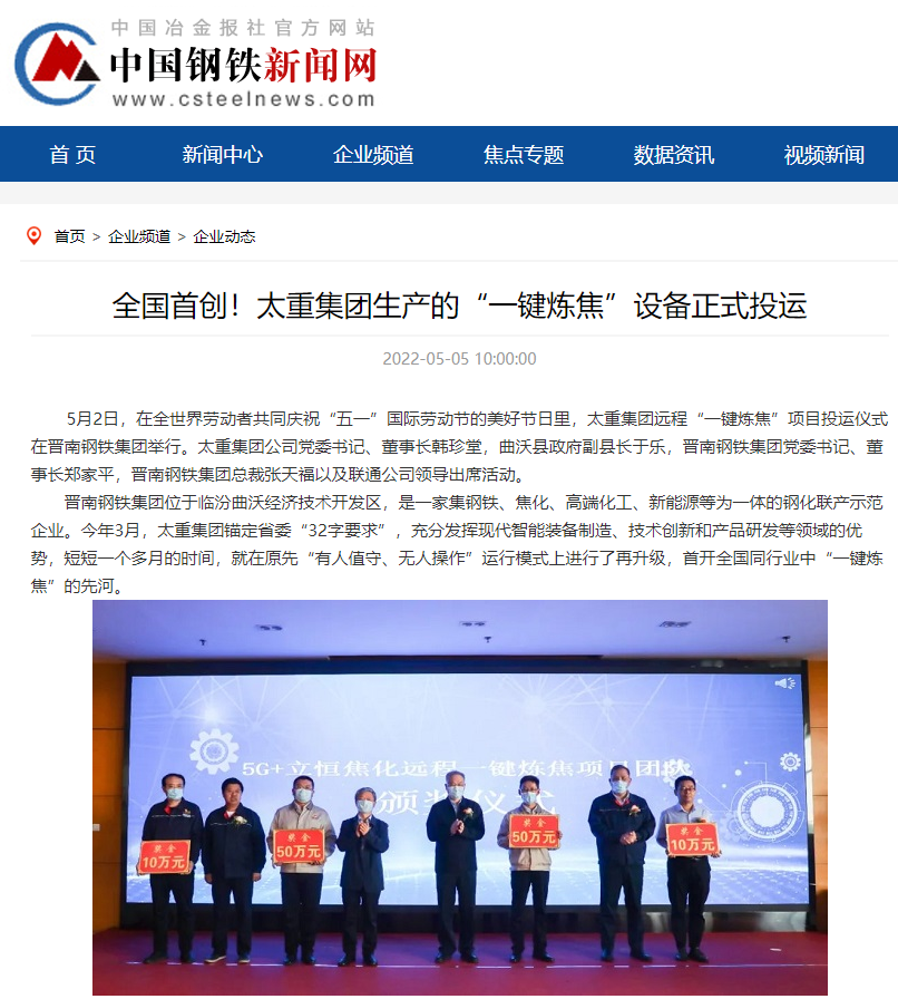 央廣網(wǎng)、中國鋼鐵新聞網(wǎng)、騰訊以《全國首創(chuàng)!太重集團“一鍵煉焦”設備正式投運》為題,聚焦太重集團以科技創(chuàng)新激發(fā)“智造”新活力為出發(fā)點,全面展示“智能+5G”在“一鍵煉焦”上的應用,助力焦化領域效能提升、節(jié)能降耗和轉(zhuǎn)型升級。中國經(jīng)濟網(wǎng)、網(wǎng)易、山西國資以《太重集團“一鍵煉焦”設備正式投運》為題,報道太重集團“一鍵煉焦”項目正式開啟智能煉焦新時代,填補技術空白,開創(chuàng)國內(nèi)焦化行業(yè)先河。搜狐網(wǎng)以《環(huán)境好了,效率高了,收益漲了!太重首創(chuàng)“一鍵煉焦”項目投運》為題,重點展示了太重集團“一鍵煉焦”項目成果,實現(xiàn)智能綠色工廠轉(zhuǎn)型再升級。山西日報、山西晚報、太原日報分別以《首開全國同行業(yè)先河!太重“一鍵煉焦”項目投入運行》《太重大發(fā)明:動動手指“一鍵煉焦”》《太重首創(chuàng)“一鍵煉焦”項目投運》為題,聚焦太重“智造”再提速,充分展現(xiàn)公司以“三性五化”為新產(chǎn)品開發(fā)目標,助力國家實現(xiàn)“雙碳”目標。