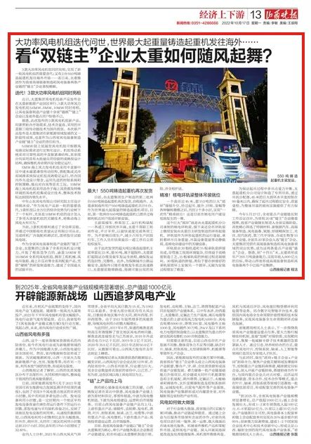 10月17日,山西晚報刊發(fā)《看“雙鏈主”企業(yè)太重如何隨風起舞?》文章,對太重集團3款大功率風電機組、550噸鑄造起重機、核電環(huán)軌梁進行報道。太重集團作為我省唯一一家“雙鏈主”企業(yè),深耕智能高端裝備制造和風電裝備領域,實施一系列提質、增效、擴量的升級改造項目,實現(xiàn)“設計研發(fā)、智能控制、三電總成、整體集成”的發(fā)展格局,集聚產(chǎn)業(yè)鏈優(yōu)勢資源,強化上下游產(chǎn)業(yè)協(xié)同,勇?lián)版溨鳌逼髽I(yè)責任,推動我省制造業(yè)高質量發(fā)展,為轉型發(fā)展蹚新路持續(xù)注入強勁動能。