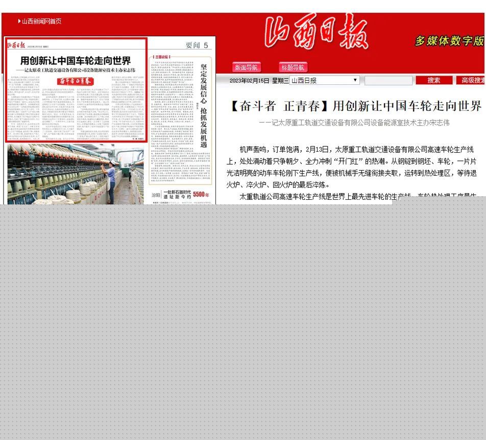 今天的《山西日報(bào)》對太重軌道交通公司設(shè)備能源室技術(shù)主辦宋志偉帶領(lǐng)創(chuàng)新團(tuán)隊(duì),在太重高質(zhì)量高速度發(fā)展進(jìn)程中,以永不懈怠的奮進(jìn)姿態(tài)做出突出貢獻(xiàn)的生動(dòng)事跡進(jìn)行了聚焦報(bào)道。