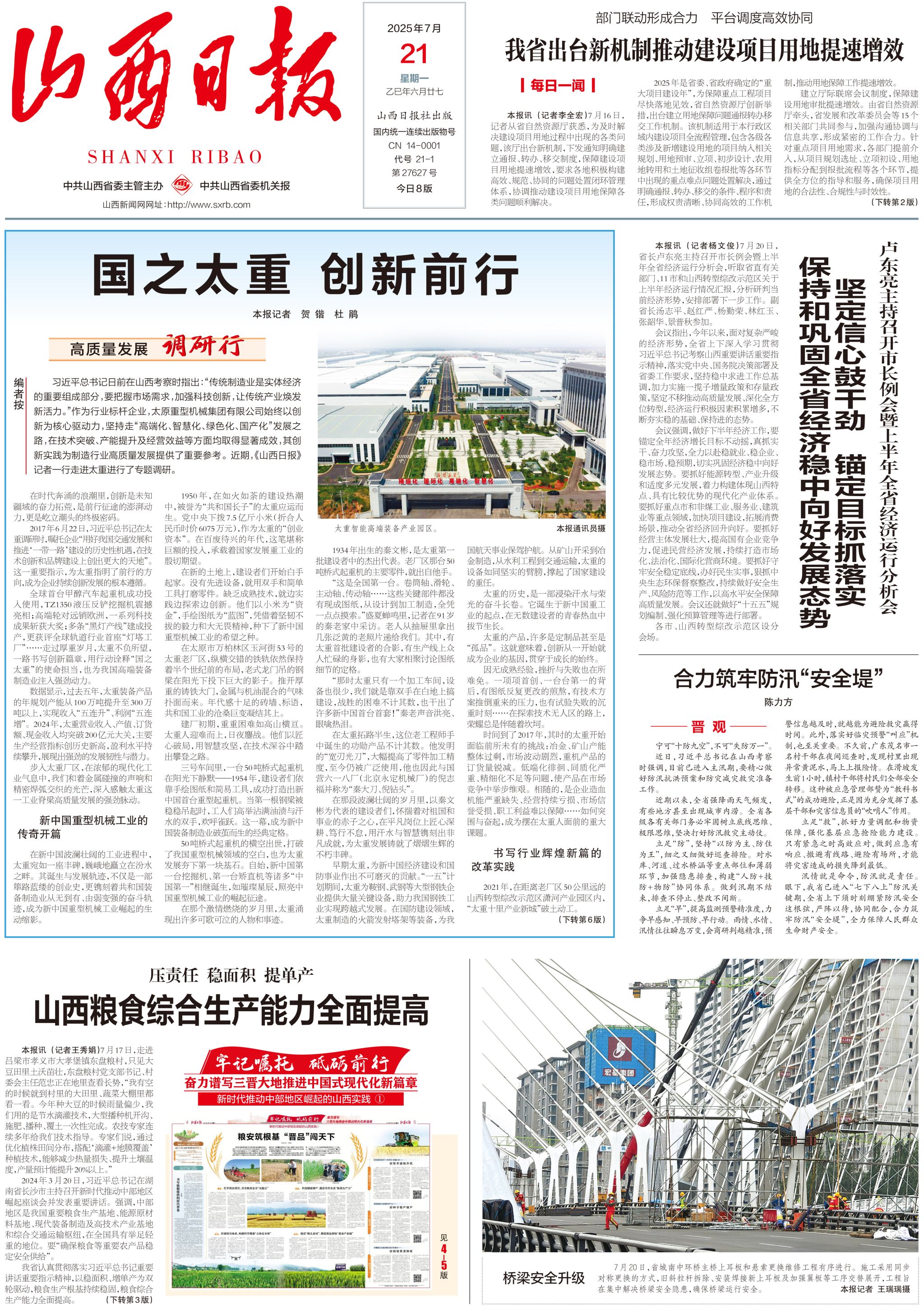 今日,山西日報【高質(zhì)量發(fā)展調(diào)研行】專欄刊發(fā)重磅文章《國之太重 創(chuàng)新前行》,頭版頭條深度聚焦“共和國長子”奮進足跡,觸摸七十載不變的強國初心,展示新時代太重奔涌不息的創(chuàng)新脈動!