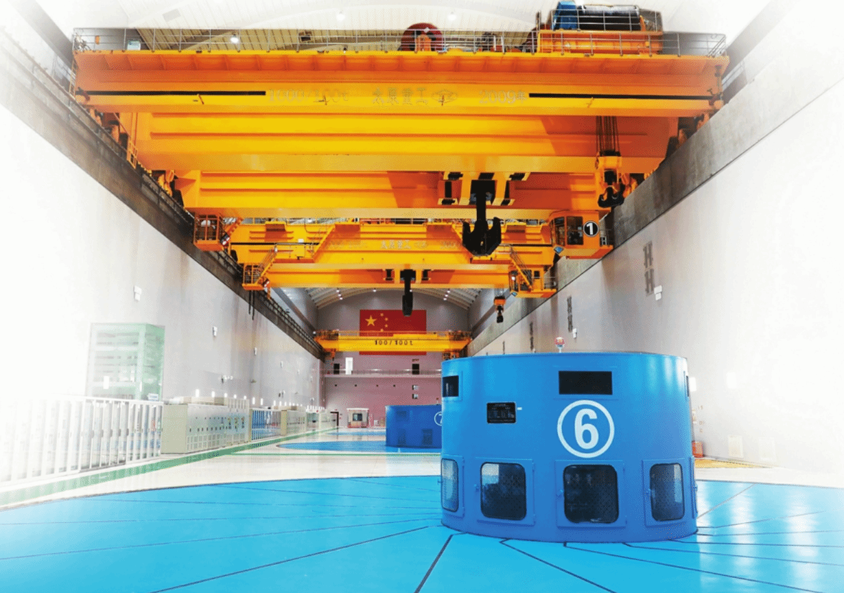 踏入這座智能化水平位居世界前列的水電站主廠房,映入眼簾的是震撼的工業(yè)圖景,耳中持續(xù)回響側(cè)排電箱發(fā)出的規(guī)律嗡鳴。廠房上空數(shù)十米處,太重研制的兩臺1000t橋式起重機正有條不紊地吊起巨大構(gòu)件緩緩掠過高空,精準地運往指定地點。沒有想象中的劇烈震顫與遲緩操作,所有動作都流暢而精準,令人贊嘆。